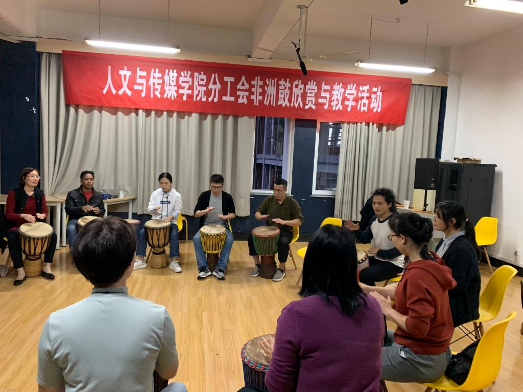 来自马达加斯加的三位留学生也来参与助兴,一场非洲鼓的欣赏与教学活动让老师们在笑声和鼓声里舒缓了疲惫、放松了精神,在笑声与鼓声中好像做了一场精神spa。同时,本活动也增强了师生感情,加强了国际间的文化交流。