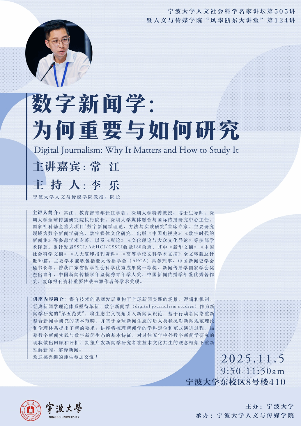 主讲人简介:常江,入选国家级人才工程,深圳大学特聘教授、博士生导师,深圳大学全球传播研究院执行院长,深圳大学媒体融合与国际传播研究中心主任,国家社科基金重大项目“数字新闻学理论、方法与实践研究”首席专家。主要研究领域为数字新闻学研究、数字媒体文化研究。出版《中国电视史》《数字时代的新闻业》等多部学术专著,以及《舆论》《文化理论与大众文化导论》等多部学术译著。累计发表SSCI/A&HCI/CSSCI收录180余篇,其中《新华文摘》《中国社会科学文摘》《人大复印报刊资料》《高等学校文科学术文摘》全文转载总计近30篇。主要学术兼职包括亚太传播学会(APCA)常务理事、中国新闻史学会秘书长等。曾获广东省哲学社会科学优秀成果奖一等奖、新闻传播学国家学会奖杰出青年,中国新闻传播学年鉴优秀青年学人奖、中国新闻传播学年鉴优秀著作奖、复印报刊资料重要转载来源作者等学术奖项。