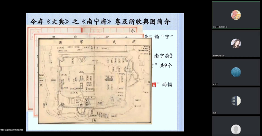 钟翀教授在讲座中向观众展示了他的最新研究成果——对现存《永乐大典》中多幅城市地图史料源流的文献学考察。中国古代的城市在由唐到宋,以及由宋到元明时期,在不同方面和不同程度上经历了空间的变革,相关的问题一直以来都受到学界的特别关注,宋元时期关于城市的传世史料因数量有限而尤显珍贵,地图资料更是如此,因此对传世史料中宋元城市地图的再发现,其学术价值是不言而喻的。从后世文献中发现并鉴定前世的史料,既是进一步深入研究的前提,也是最考验专业功底的研究过程。存世的《永乐大典》大约只占原书的3%~4%,在这种文献残缺不全,而且前人研究成果丰富的条件下来订正地图资料的史源,其难度可想而知。钟教授通过考察《永乐大典》的征引文献目录、对地图内容与文献记载进行互勘等技术手段,以极其细致缜密的考证,揭示了存世《永乐大典》中数幅城市地图的史料来源为宋元时期的几种散佚方志,即:《建武军图》和《安南国图》出自宋代《淳祐建武志》;“(汀州)郡城”图应源自南宋的《开庆临汀志》;《潮州路城图》应出自元代的《至顺三阳图志》;以及“河南志图”极可能源自元代的《河南志》。对于此类专业性很强的研究,钟教授按照由浅入深,由易到难的顺序,层层递进地进行阐释,令线上师生深入了解了《永乐大典》这种“错综史料”的基本特点,并认识到地图文献的复杂性。