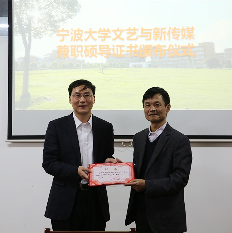 院长张伟教授为五位兼职导师颁发了证书。“文艺与新传媒”硕士点7位校内导师和2017级5位硕士研究生参加了仪式。