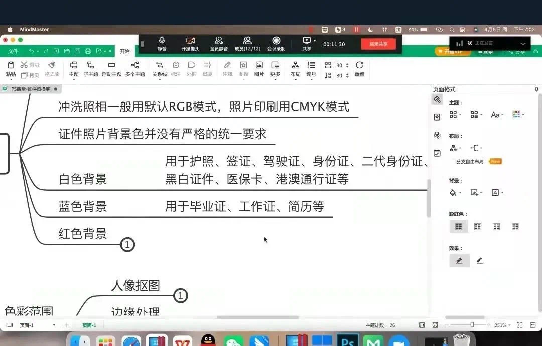 4月5日晚,施杨同学带来关于Photoshop的实用教程。施杨同学从日常的证件照换底入手,给大家演练了具体的操作步骤,课后也留下了相关文档,便于同学们后续的上手运用。在人像修图中,施杨同学选取影视剧中人物的截图,通过裁剪大小、去除水印,人像磨皮等,从多角度、多方法让人物更加灵动和美观。