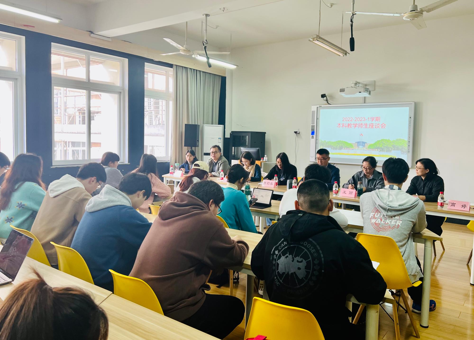 在10-208召开2022-2023-1学期本科教学工作师生座谈会。学院党委委员田启涛老师、学院教育督导委员会主任周莉萍老师、学院督导徐琼老师、汤志耘老师,新闻传播系副主任王丽老师、中文系副主任周景耀老师、教务办高婷老师、钟凤娟老师以及2020级、2021级、2022级各班学生代表参加了此次座谈会。