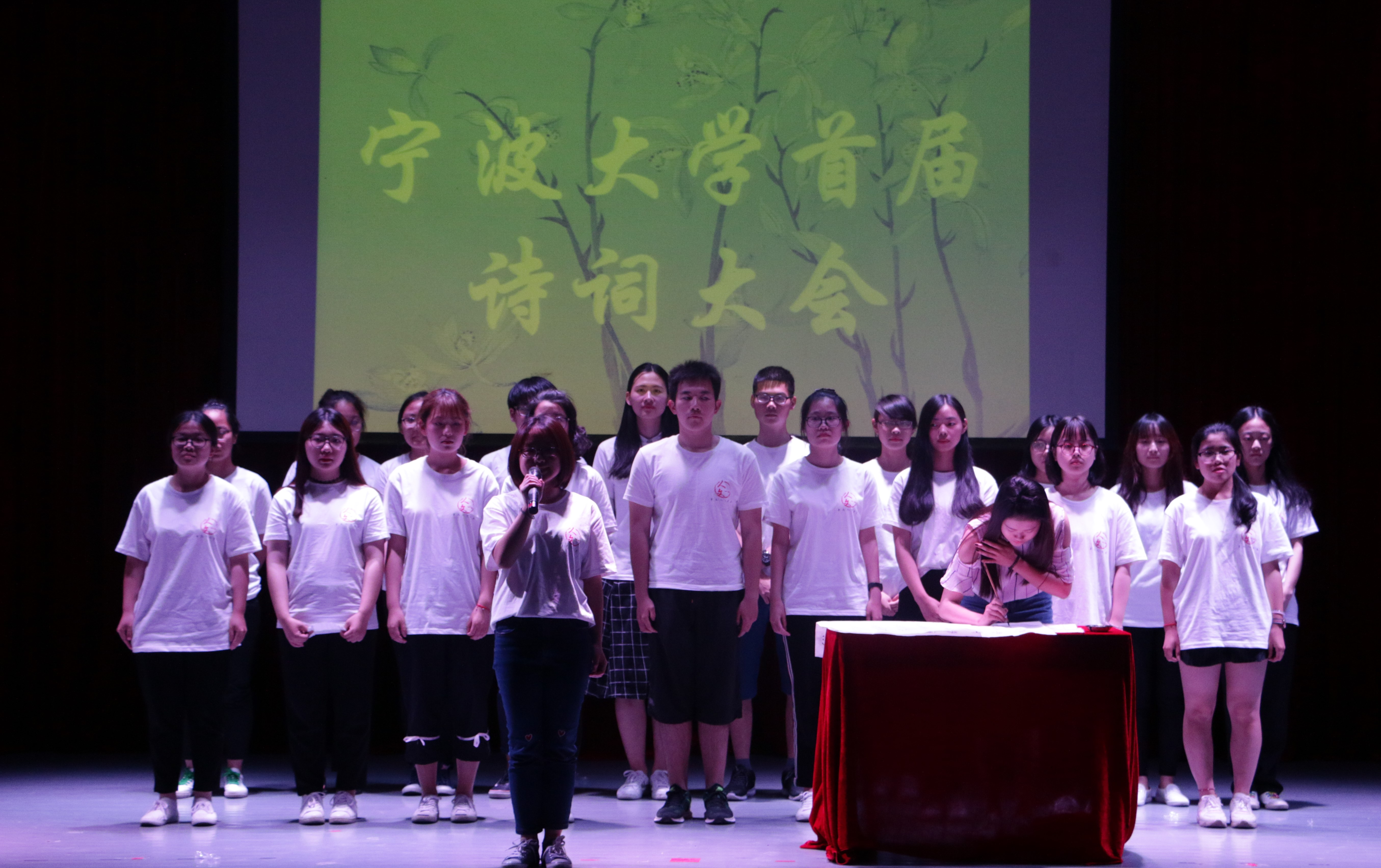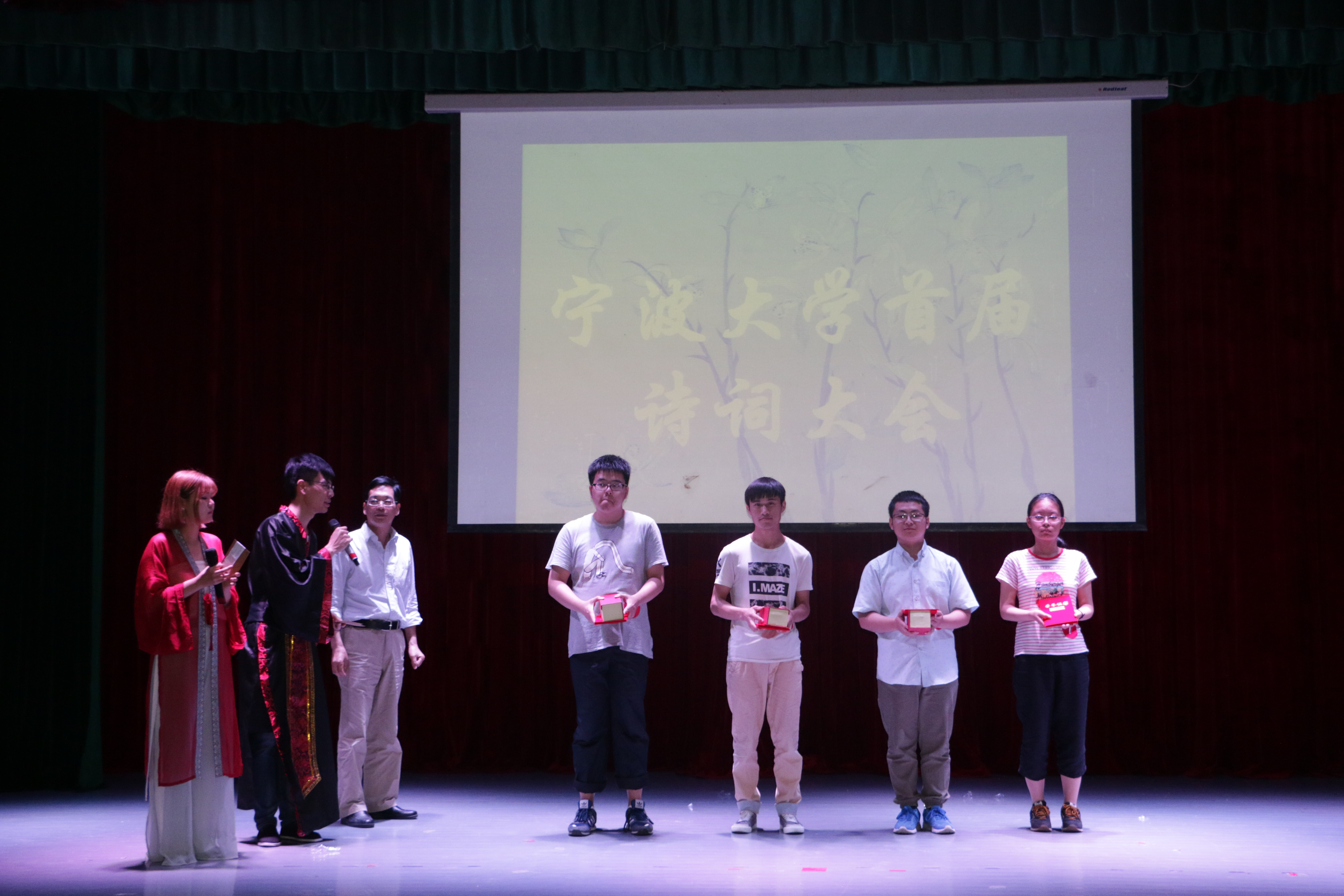 祁生明、吴俊辉同学分别夺得诗词大会亚军和季军。首届诗词大会参赛选手经过为期一月的初赛、复赛的层层选拔,当晚在锦绣小剧场决赛舞台上展开激烈角逐。现场比赛分为“龙争虎斗”、“金戈铁马”、“万象森罗”、“擂主争霸”四个环节,选手根据诗词抢答、看画吟诗、依字猜诗等不同题型比拼作答。张如安教授、薛显超老师和周景耀老师三位评委对比赛各环节中出现的部分诗词做出精彩而又深刻点评。张如安教授表演了经典国学文化——吟诵,赢得台下观众阵阵掌声。怡韵舞蹈社、草尖相声社、书画协会、校园十佳歌手等社团也为本届诗词大会献上了精彩节目。晚会最后,擦边直播
