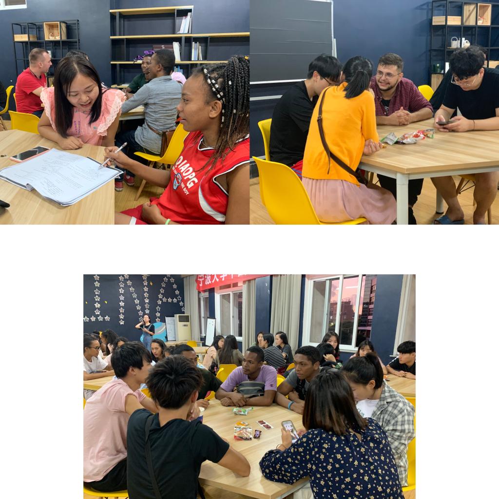 在中国学生的帮助下,大家将桌椅摆放成一个个圈,每组坐四到五名留学生和一到两名中国学生,志愿者们为大家准备了小零食。一开始,大家就积极投入到了交流会话当中。志愿者吴沁蓉所在的小组有三名韩国留学生,他们用汉语交流了中韩美食和影视文化,随后汉语国际教育专业的留学生魏嘉诚加入进来,他们玩了汉字棋和狼人杀等游戏,充满趣味。