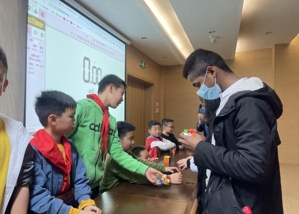 的学生将其魔方打乱顺序,再由双方队员比赛复原。