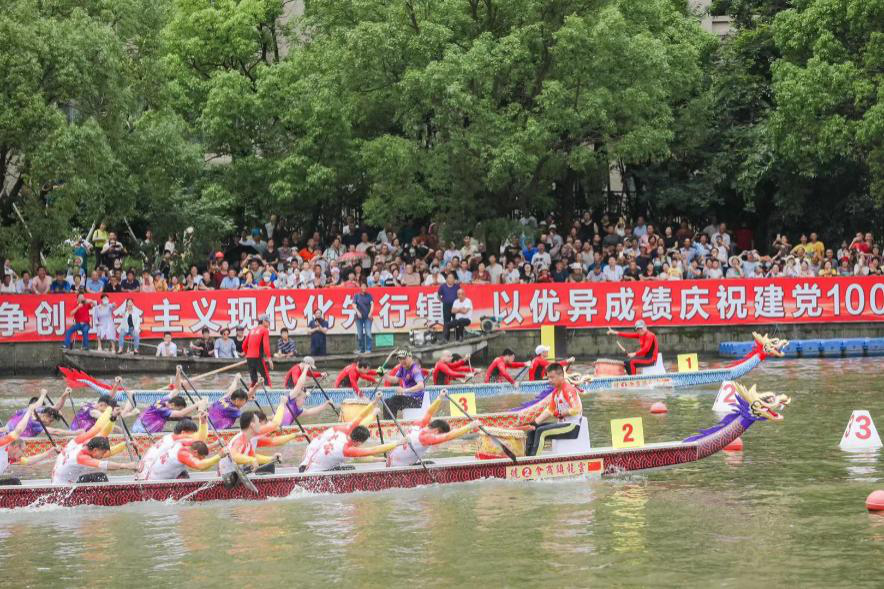 本日首先是云龙镇“羽人竞渡”杯龙舟邀请赛的比赛日。比赛形式为500米直道竞速赛,22支比赛队伍被分为9组3个赛道,并且还另外邀请了4支江西龙舟表演队。“鼓是令,梢是命。”龙舟竞渡关键看团队合作,船头击鼓定节奏,两旁的水手要听鼓声划桨,竞舟的同时更齐喊号子加油鼓劲,别开生面。而此次比赛不仅有企业队、学生队,云龙各村都有自己的龙舟队参加,现场群众为各自龙舟队加油呐喊,更是声浪不断。各国学生在观看比赛的过程中,深深为中国浓厚的社区民俗文化热情所触动。