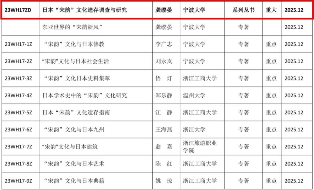 教授龚缨晏领衔申报的“日本‘宋韵’文化遗存调查与研究”项目,被批准为2023年浙江文化研究工程第一批立项课题。该项目共有十个子课题,分别由浙江大学、擦边直播