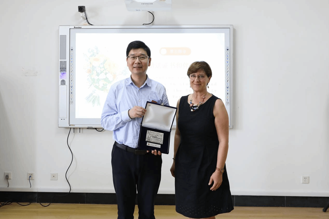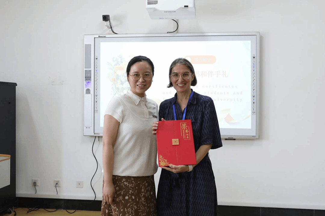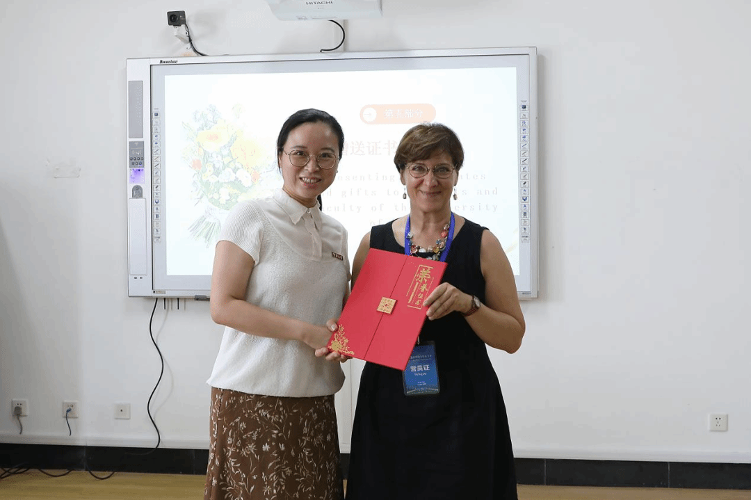 国际处处长周洵瑛为维罗纳大学来访师生颁发了证书,以表彰他们在夏令营中的出色表现。而李乐院长则代表学院向维罗纳大学师生赠送了精心准备的伴手礼,寓意着两校之间的深厚情谊。
